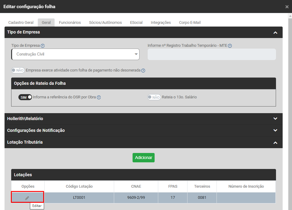 Edite o cadastro das Configurações do Módulo Folha de Pagamento e acesse a aba Geral>Lotação Tributária
