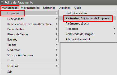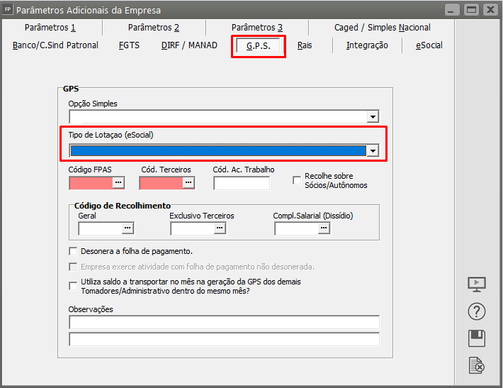 VerifiqueAcessequal lotaçãoestá informada emmenu ‘Manutenção>Empresas>Parâmetros Adicionais da Empresa’Acesse na abaAba G.P.S e verifique a lotação: