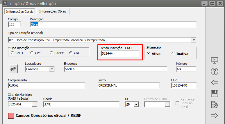 Edite a obra que apresentou rejeição pelo eSocial e corrija a informação cadastrada no campo Nº da Inscrição - CNO