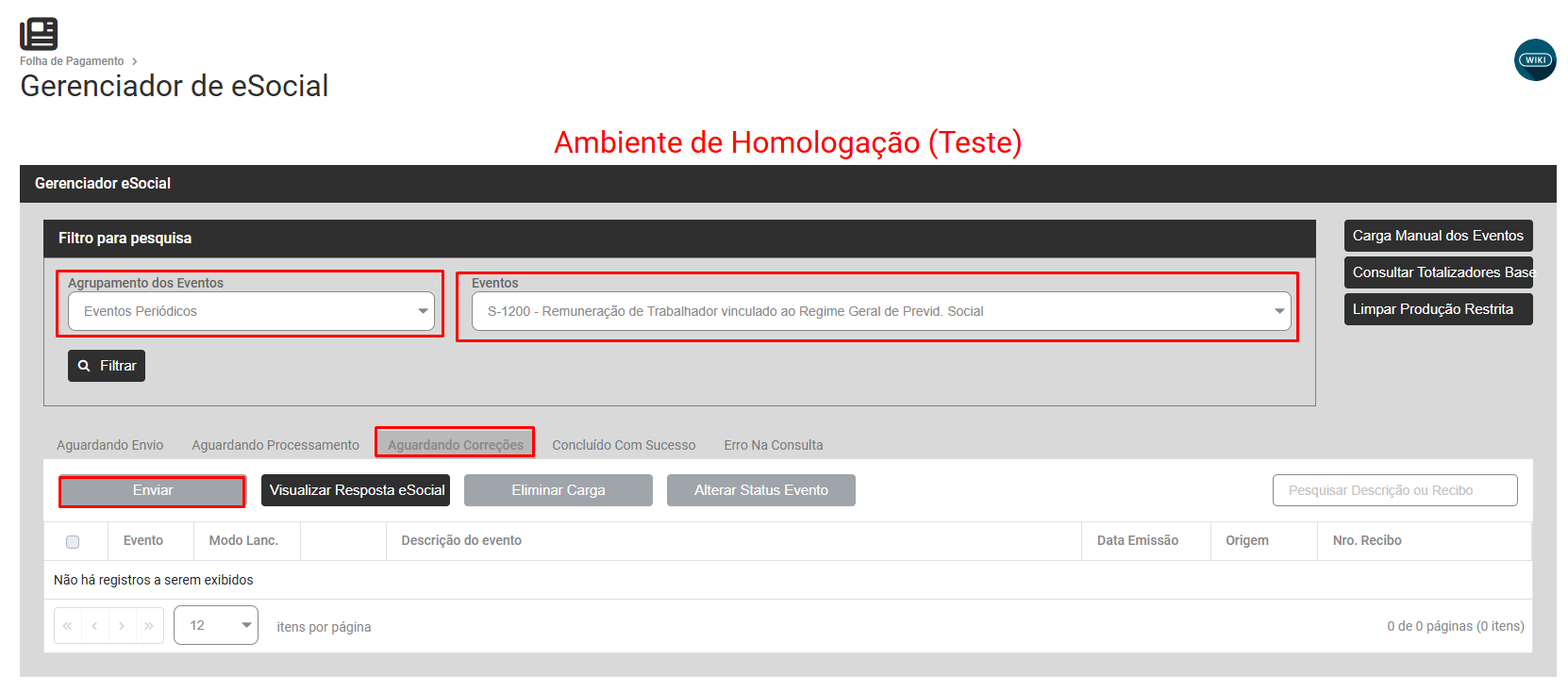 Filtre por Eventos Periódicos, S1200 - Aguardando Correção, selecione o evento e faça o envio para o Portal do eSocial