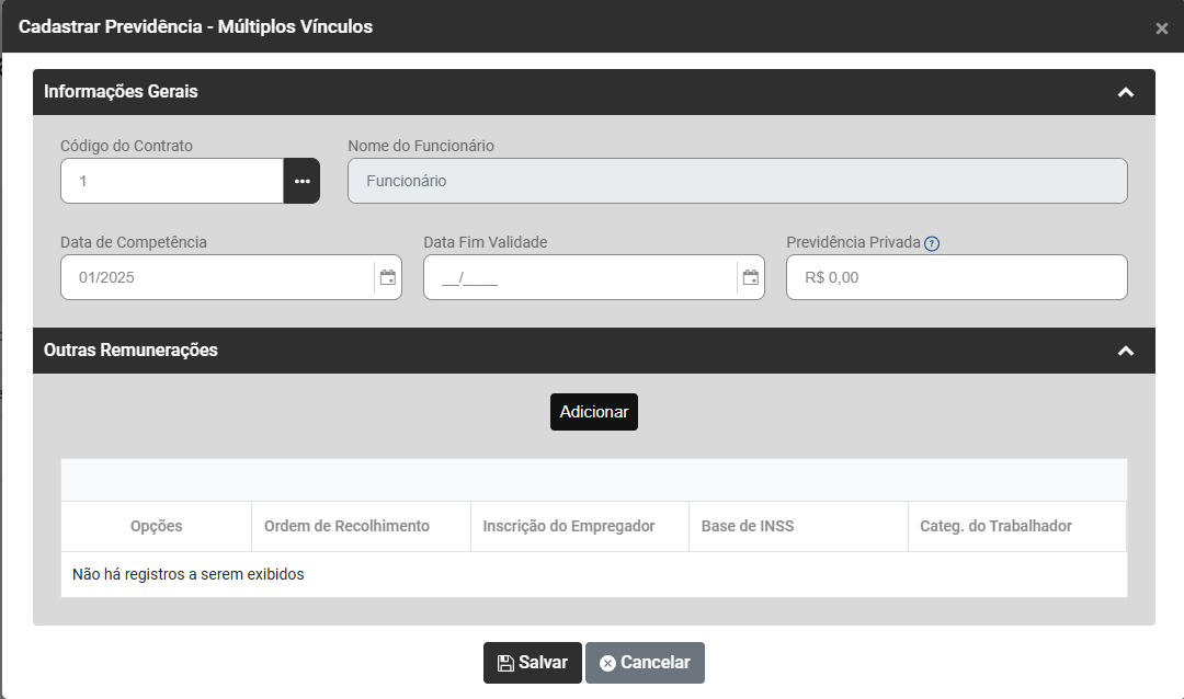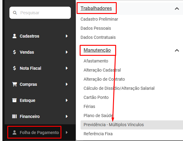Correção: Acesse o menu Folha de Pagamento>Trabalhadores>Manutenção>Previdência - Múltiplos Vínculos