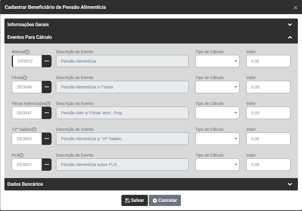 Se o funcionário tiver mais de um beneficiário de pensão alimentícia, deverão ser criados mais quatro eventos (mensal, férias, 13º salário e PLR) para cadastrar no segundo beneficiário, pois trata-se de um outro desconto.