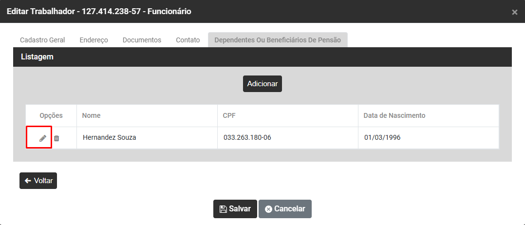 Edite o cadastro do Beneficiário da Pensão Alimentícia do Trabalhador e confira: