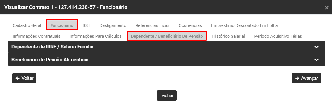 Edite os Dados Contratuais do trabalhador que apresentou a inconsistência e acesse a aba Funcionários>Dependente/Beneficiário de Pensão - Cadastro do Beneficiário de Pensão Alimentícia
