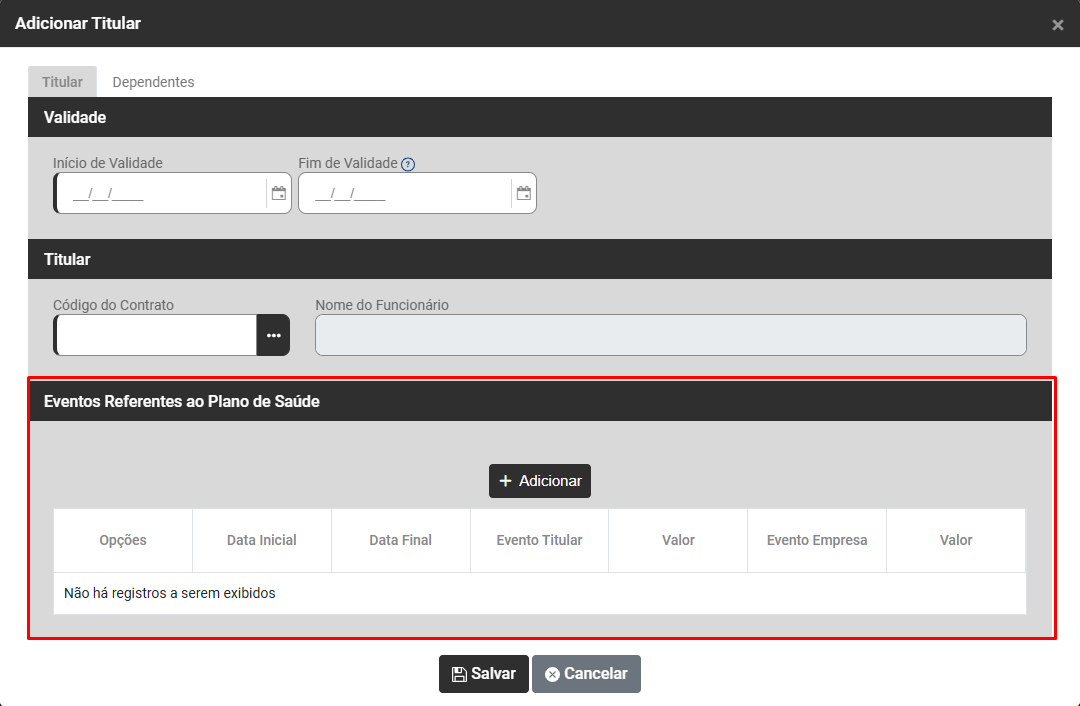 Em seguida informe os Eventos Referente ao Plano de Saúde do TITULAR (TRABALHADOR) clique no botão Adicionar