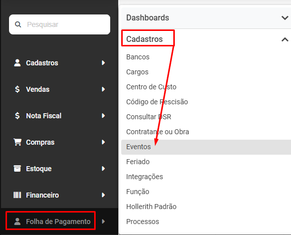 O Sistema possui três eventos internos que podem ser utilizados, para o desconto do Plano de Saúde e Plano Odontológico, para visualizá-los acesse o menu Folha de Pagamento>Cadastros Eventos