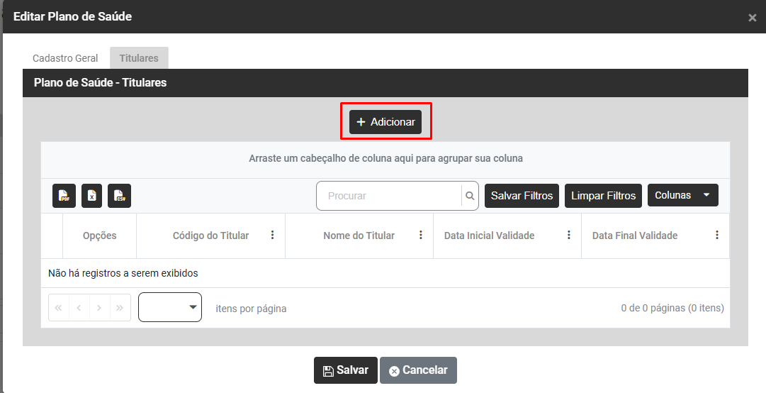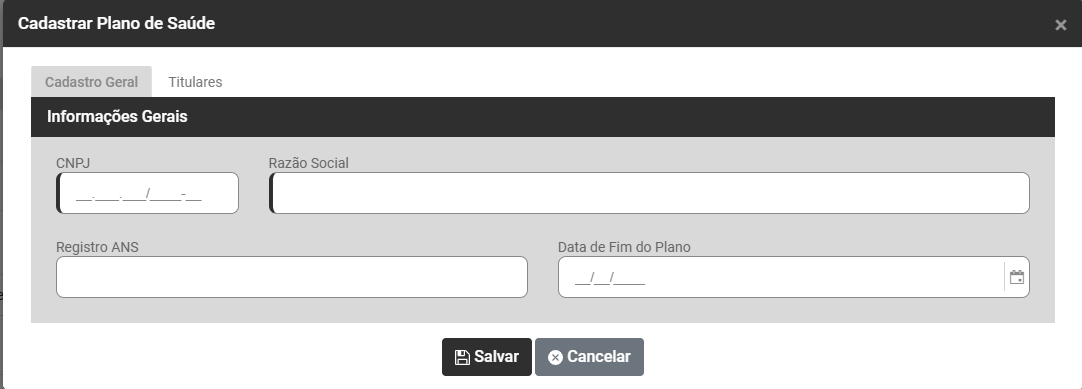 Aba Cadastro Geral, cadastre o plano de saúde informando: