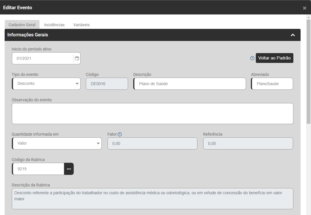 Caso a empresa prefira poderá criar outros eventos para os descontos de Plano de Saúde, basta que no momento do cadastro deste novo evento siga o Modelo dos Eventos internos do Módulo Folha de Pagamento (DE0016, DE0060, DE0015)