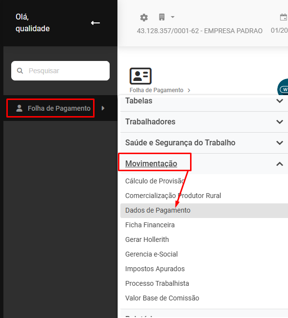 Solução: Acessar o menu Folha de Pagamento>Movimentação>Dados de Pagamento