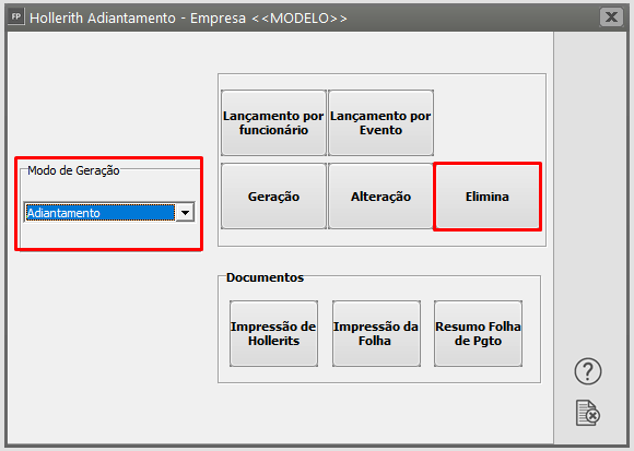 Para eliminar, defina o sistema no mês/ano da referência e acesse o menu Movimentação > Rotinas Mensais > Geração Holerith Funcionários > Defina o modo geração e clique no ícone Elimina: