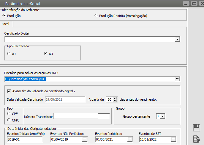 Correção: Acessar o menu Manutenção > Empresas > Parâmetros do eSocial e copiar o endereço definido para salvar os XMLs