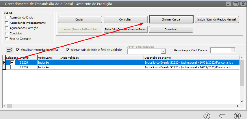 Em caso negativo, acesse o Gerenciamento de Transmissão do eSocial e apague a carga do evento S2220 que foi rejeitada pelo Portal do Esocial