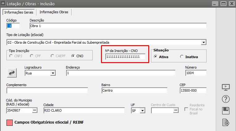 Ação Sugerida: Se Indicativo de Obra for igual a 1 - (Empreitada Total), o número do CNO informado
