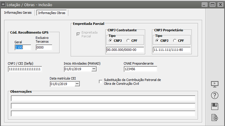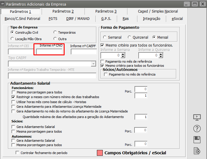 Acesse o menu Manutenção > Empresas > Parâmetros Adicionais da Empresa - aba Parâmetros 1 e confira a informação do campo Informe nº CNO