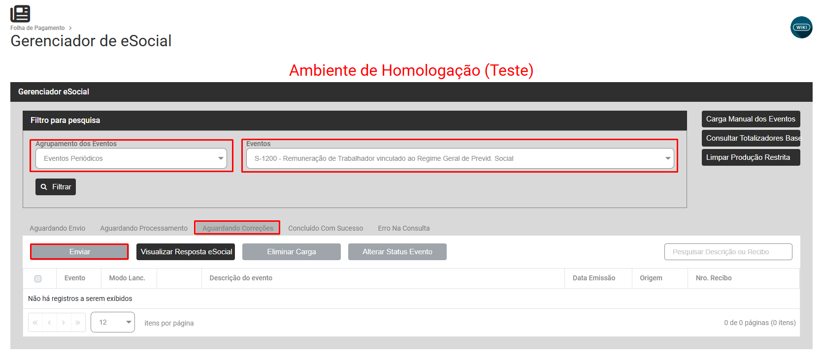 Defina Eventos Periódicos - S1200 - Aguardando Correção, selecione o evento que apresentou o erro e faça o envio para o Portal do eSocial