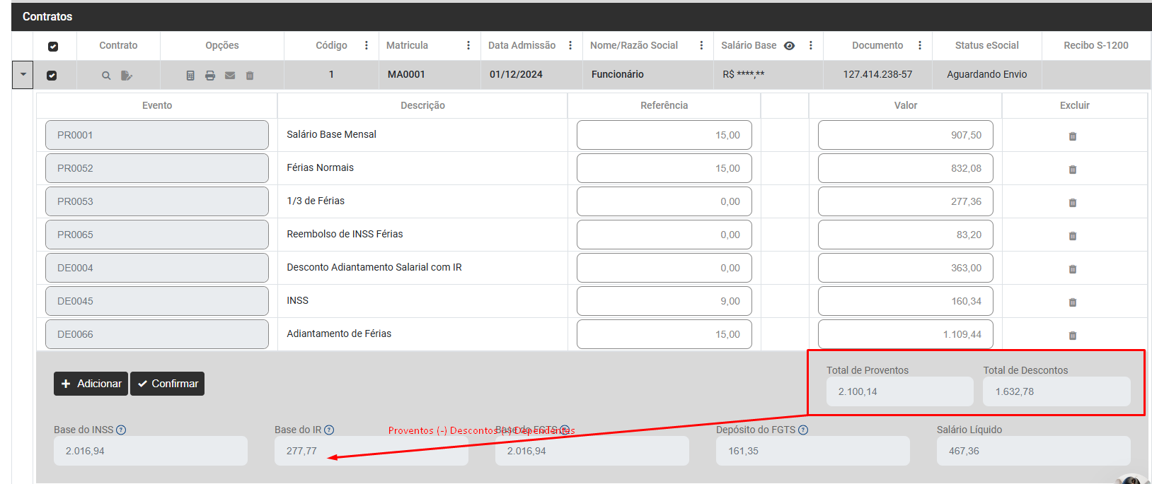A Base de Cálculo do IRRF deve ser o total de proventos (-) total de descontos que possuem incidência de IRRF