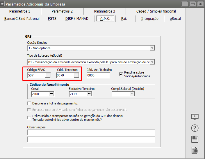 Ação Sugerida: Informar o FPAS e o código de terceiros correspondente