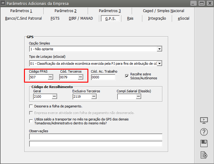 e informe o Código FPAS e o Código de Terceiros da empresa
