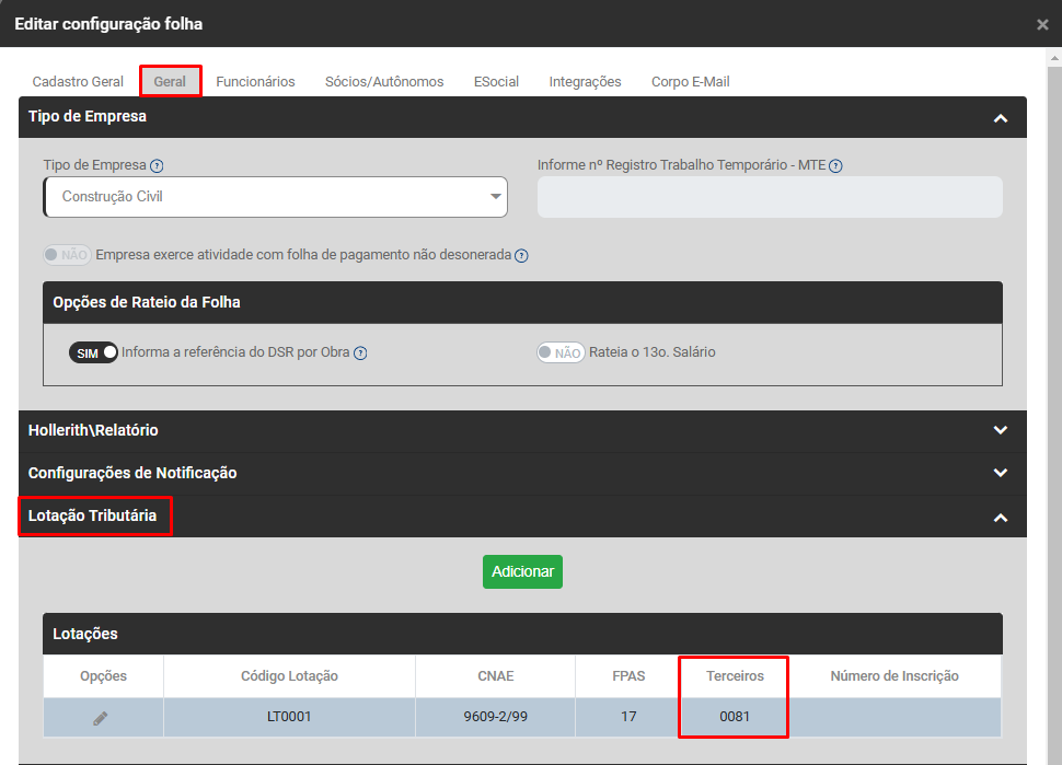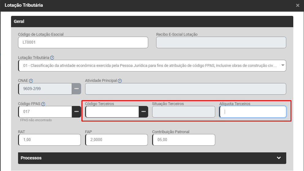 Na aba Geral>Lotação Tributária verifique se você informou Código de Terceiros