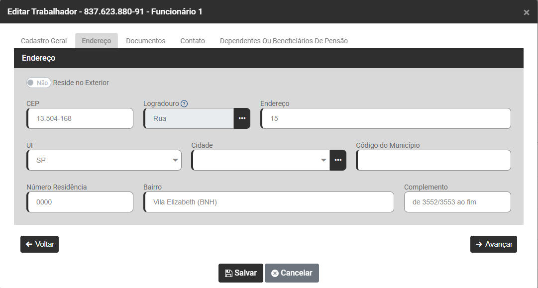 Edite os Dados Pessoais do Trabalhador que apresentou a inconsistência e acesse a aba Endereço