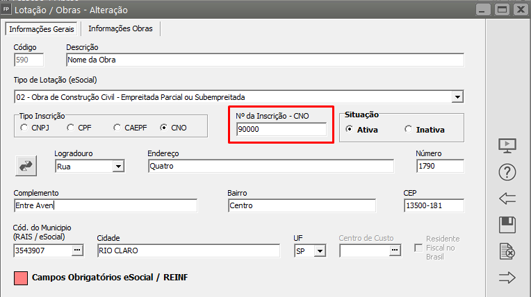 Ação Sugerida: Se o tipo de lotação indicar empreitada parcial [02], o CNO informado no campo Número da Inscrição deve pertencer ao CNPJ/CPF indicado no campo Número de Inscrição do Proprietário.