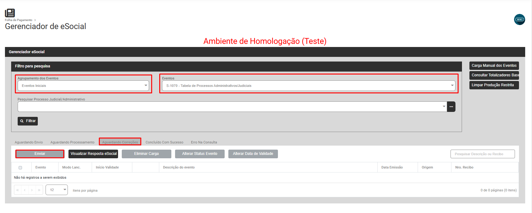 Filtre por Eventos Iniciais - S-1070 - Aguardando Correção e selecione o evento que apresentou a inconsistência e envio novamente a informação para o Portal do eSocial