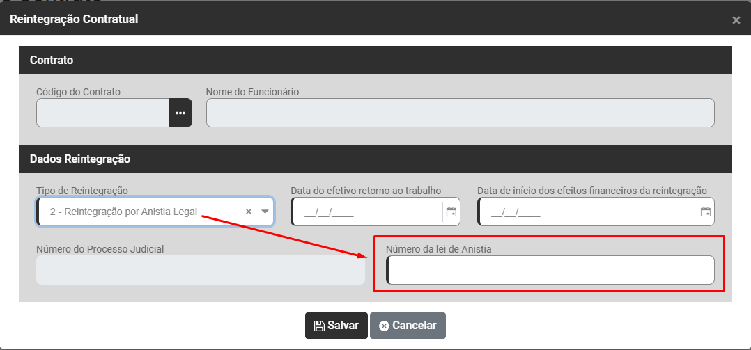 Ação Sugerida: O campo número da Lei de Anistia é obrigatório quando o campo Tipo de Reintegração for = [2] - Reintegração por Anistia Legal. Caso contrário o campo não deverá ser preenchido.