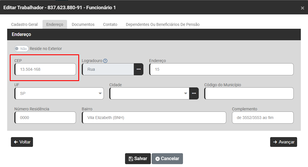 Edite os Dados Pessoais do Trabalhador que apresentou a inconsistência e acesse a aba Endereço