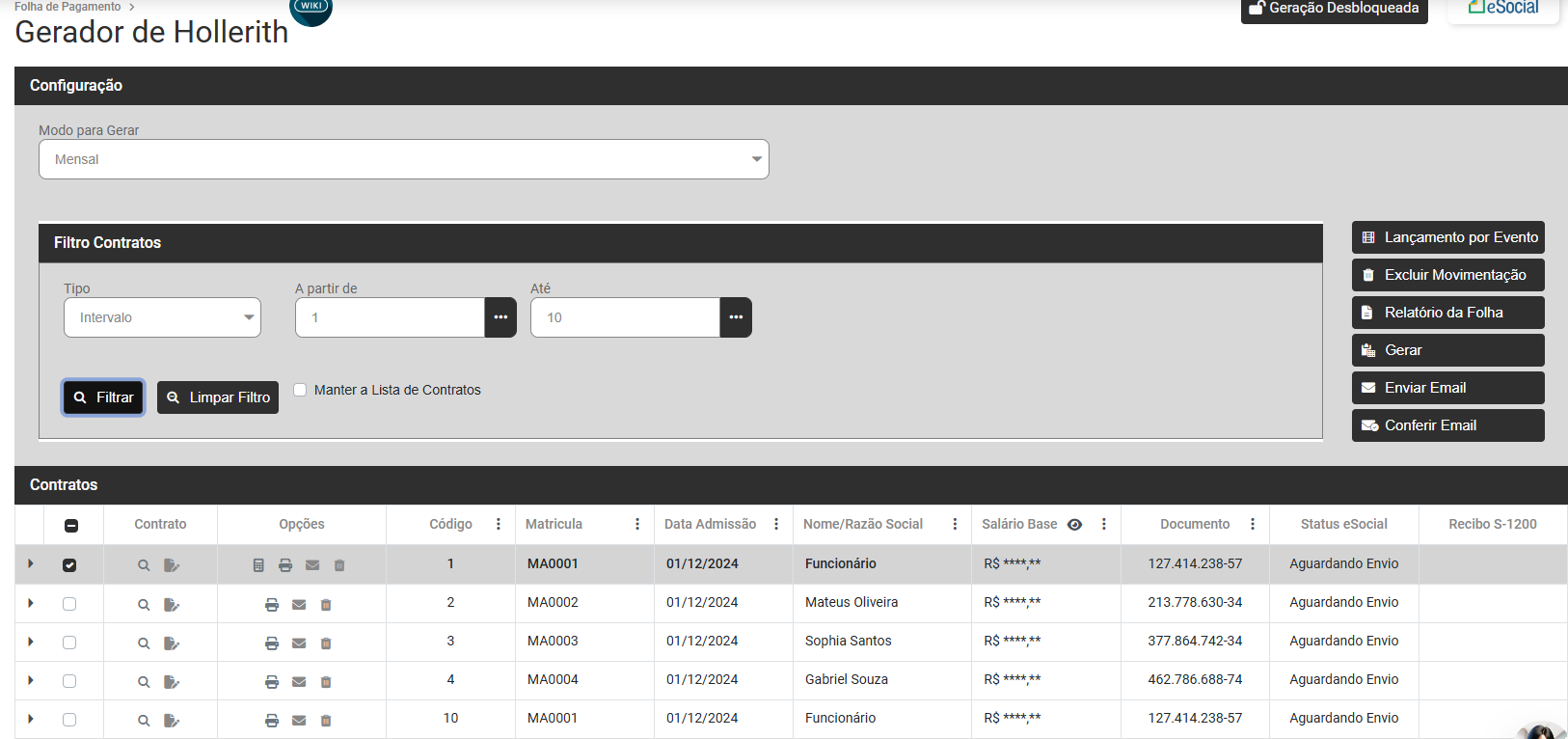 Defina o Modo de Geração e em seguida filtre pelo código do funcionário