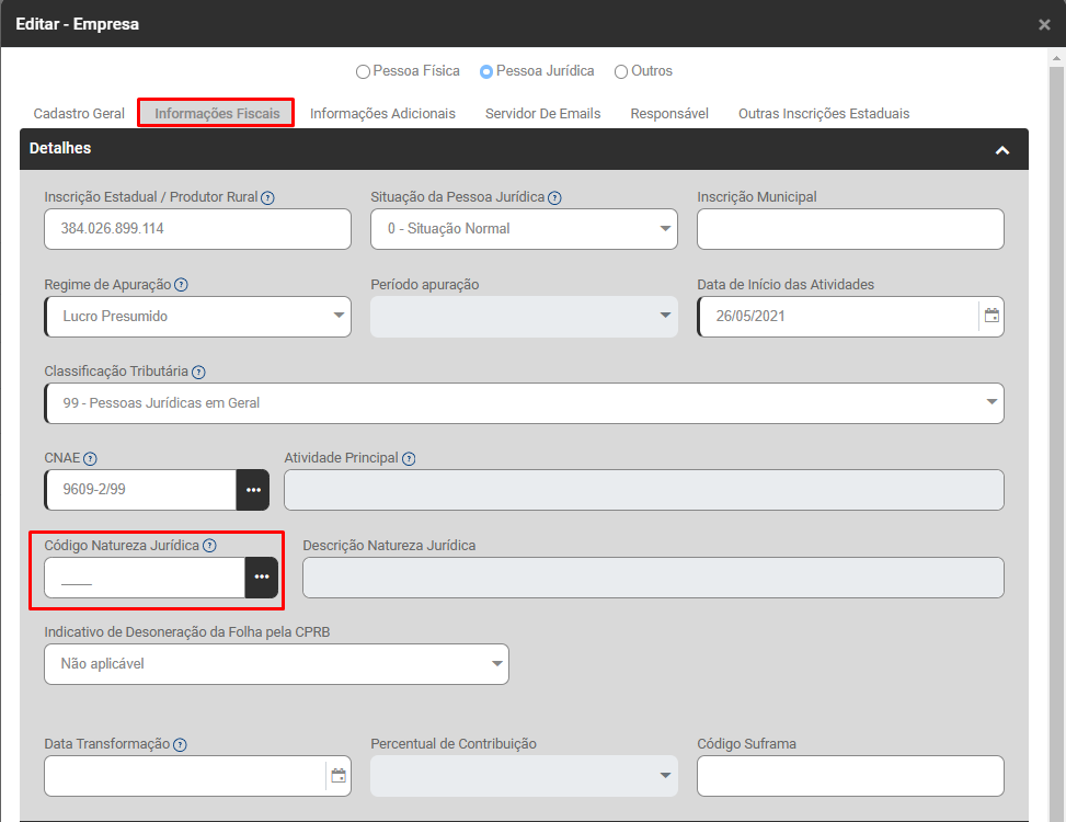 Ação Sugerida: O preenchimento do campo é obrigatório e exclusivo para empregador PJ. Neste caso, deve ser um código existente na Tabela 21 (Natureza Jurídica) e compatível com a informação constante no CNPJ.