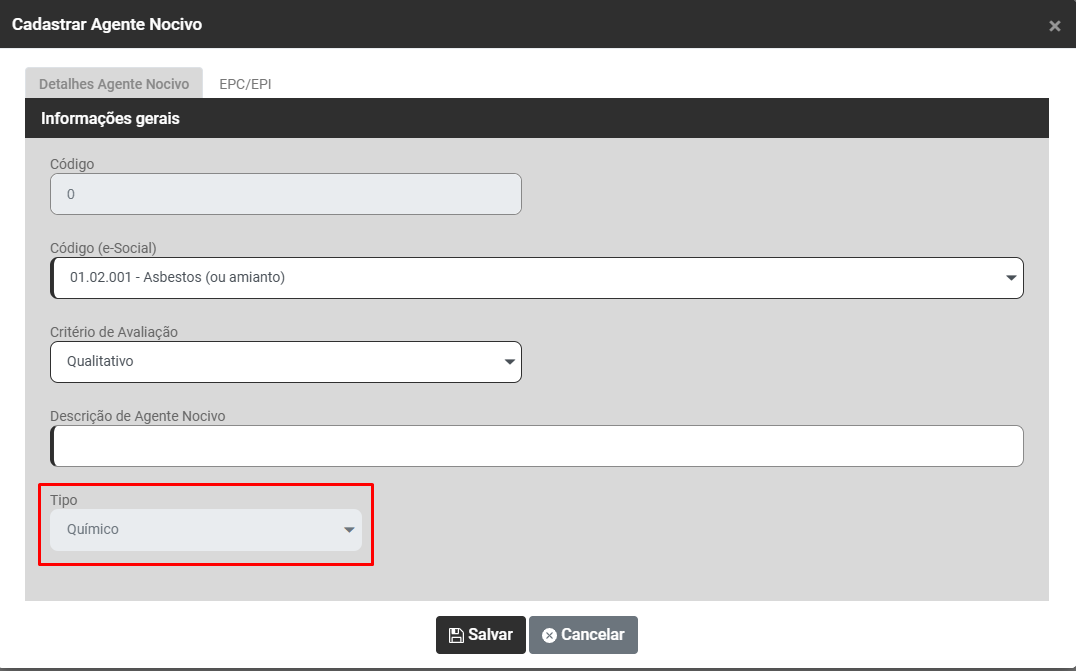Caso você ainda não possua o agente nocivo cadastrado faça o cadastro e em seguida faça o envio para o Portal do eSocial