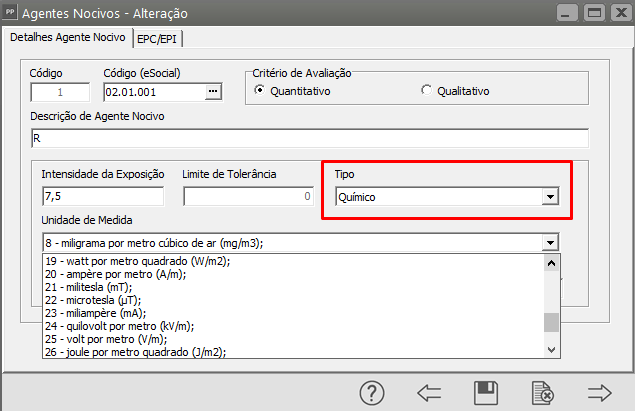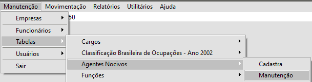 Correção: Acesse o Sistema PPP no menu Manutenção > Tabelas > Agentes Nocivos > Manutenção