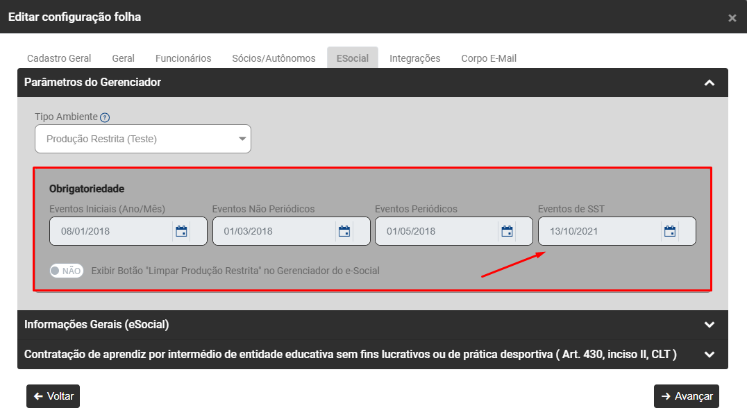 Edite as Configurações da Empresa que apresentou a inconsistência na aba ESocial e faça conferência do campo Obrigatoriedade