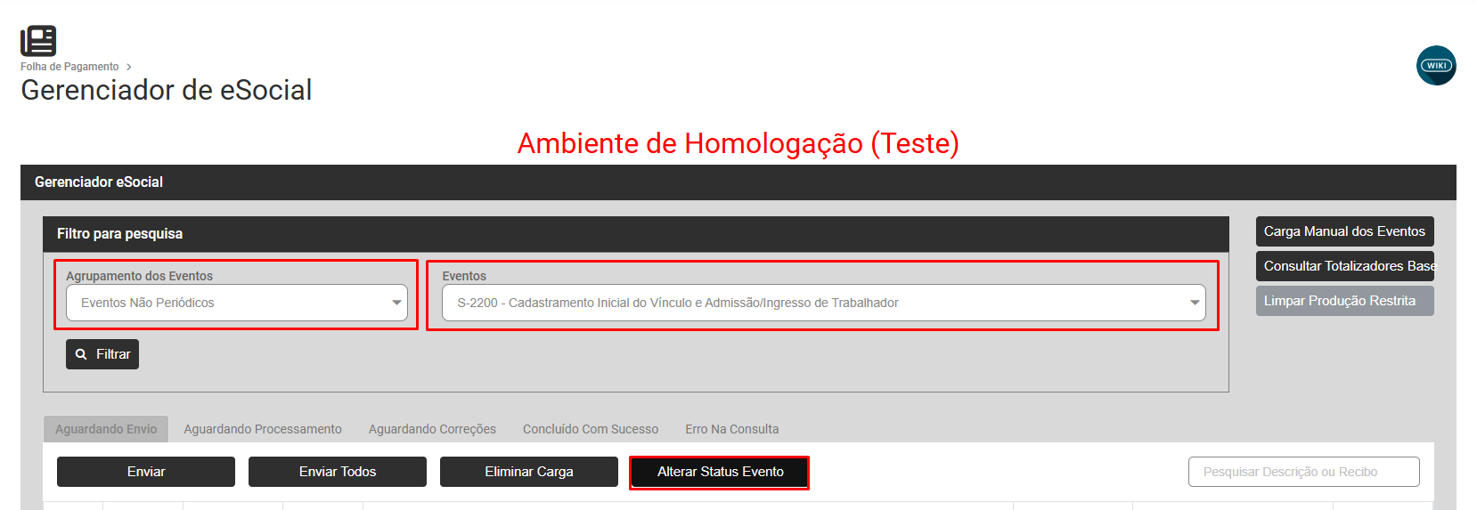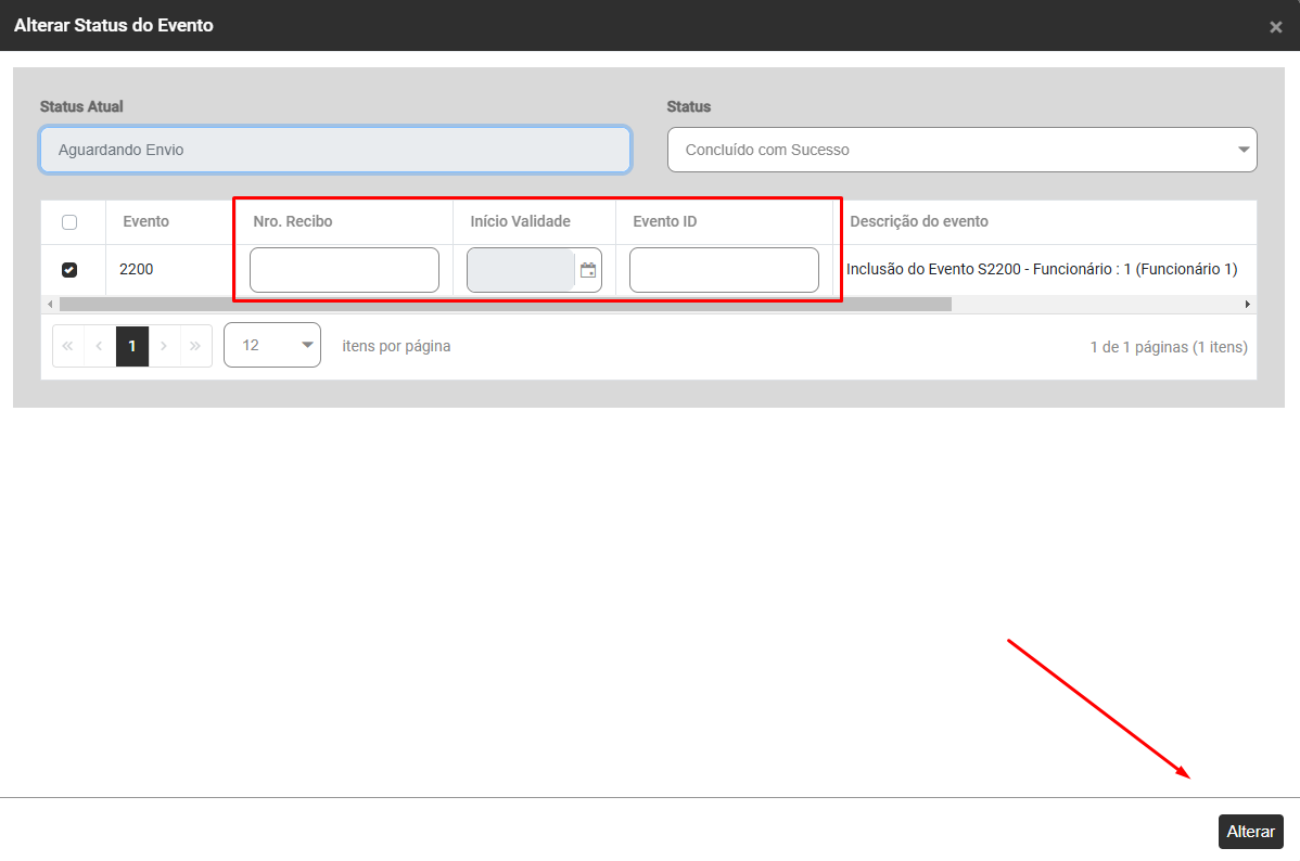 Filtre por Eventos Não periódicos - S2200 - Aguardando Correção e clique no Botão Alterar Status do Evento