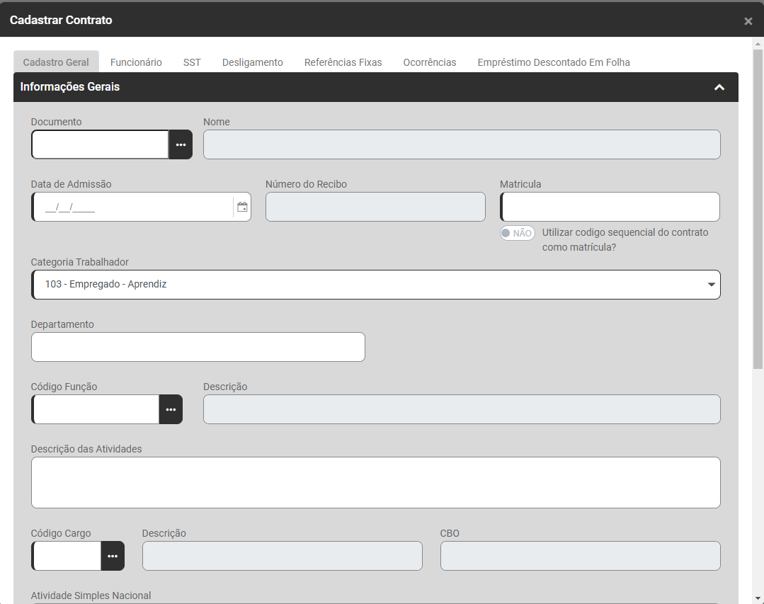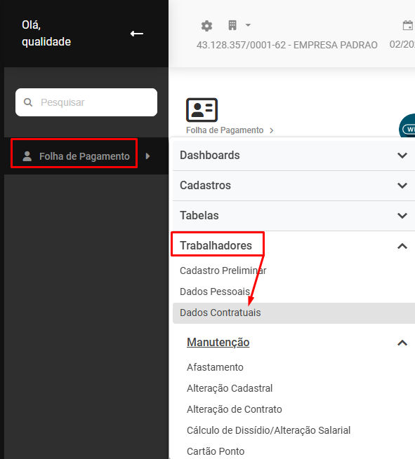 Correção: Acesse o menu Folha de Pagamento>Trabalhadores>Dados Contratuais