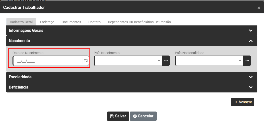 Edite os Dados Pessoais do Trabalhador que apresentou a inconsistência e acesse a aba Cadastro Geral>Nascimento, faça a conferência do campo Data de Nascimento