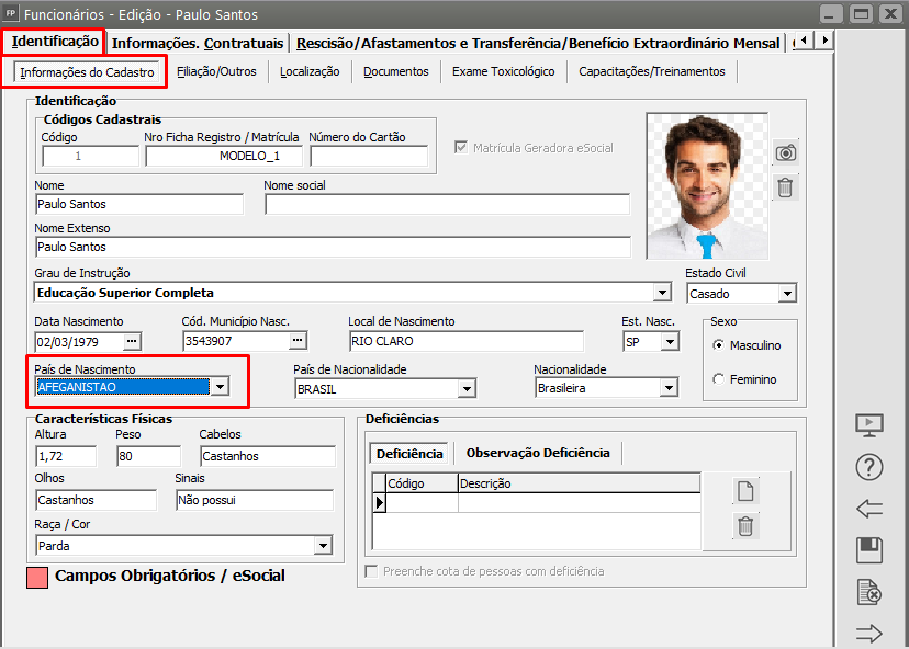 Ação Sugerida: Verifique se o campo ‘País de Nascimento’ no cadastro do funcionário, está preenchido, e se está com a informação correta.