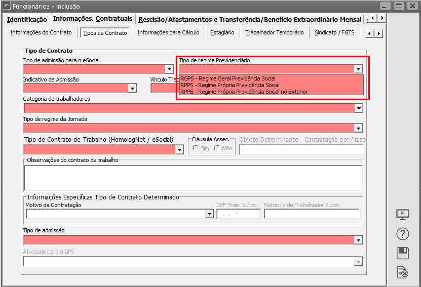 Acesse o cadastro do funcionário no menu ‘Manutenção>Funcionários>Manutenção de Funcionários>Manutenção’, na aba ‘Informações Contratuais>Tipos de Contrato’ o campo ‘ Tipo de Regime Previdenciário’ precisa estar preenchido corretamente: