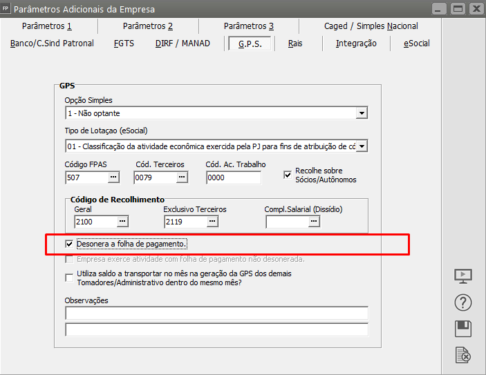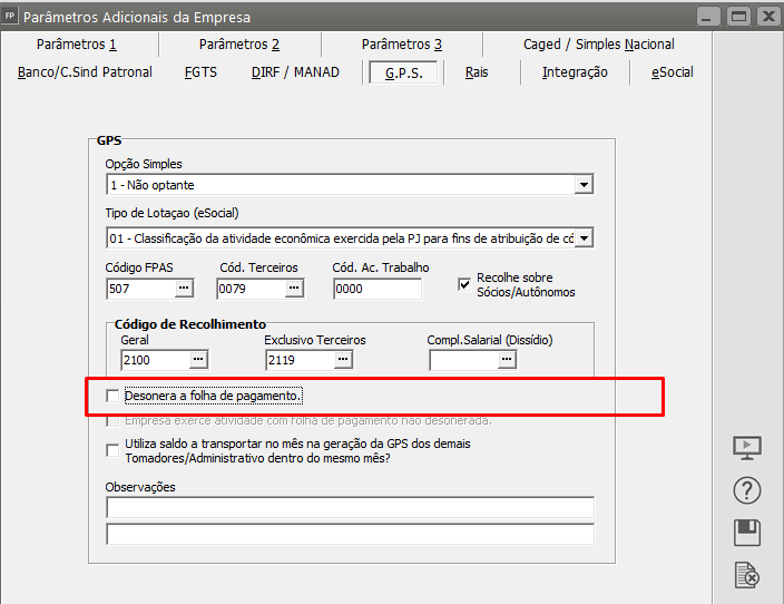 Não Poderá ser informado no Menu Manutenção >Parâmetros Adicionais da Empresa - aba G.P.S. que a empresa possui Desoneração da Folha de Pagamento