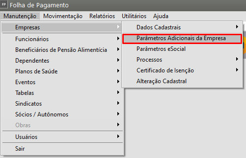 Correção: Acesse o menu Manutenção > Empresas > Parâmetros Adicionais da Empresa.
