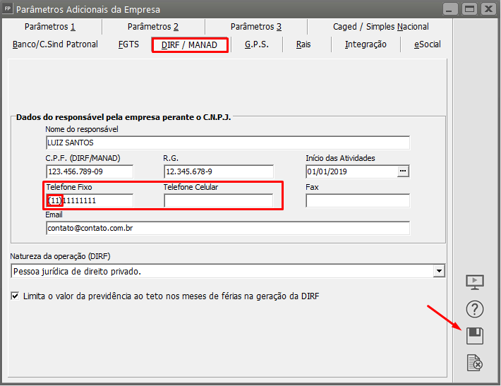 Na aba DIRF/MANAD, verifique se os telefones indicados possuem 10 dígitos: