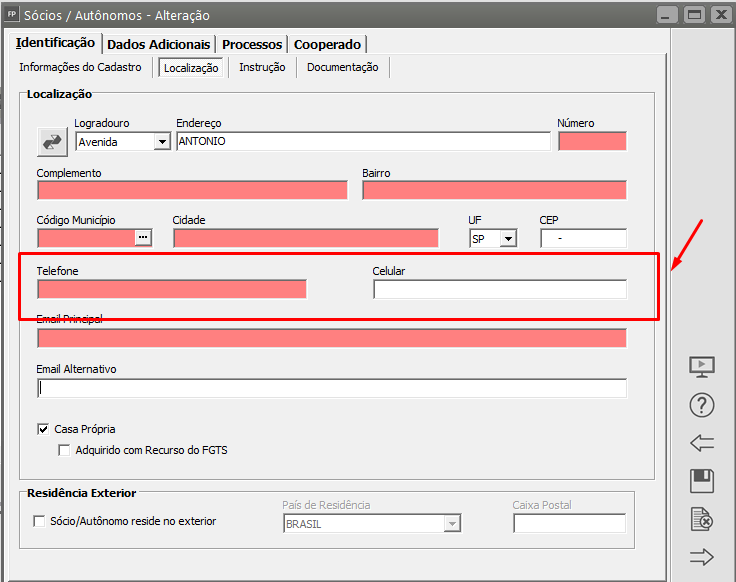 Acesse a aba Identificação > Localização e confira a informação digitada no campo Telefone e Celular
