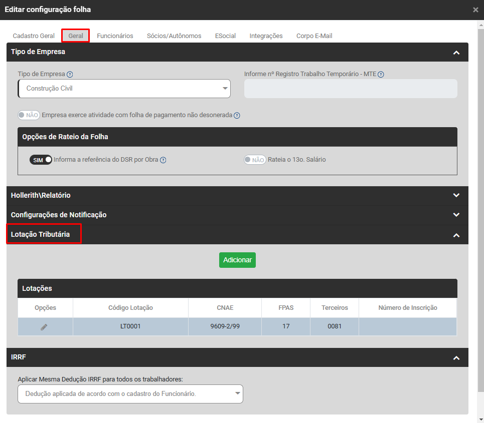 Edite as Configurações da Empresa que apresentou a inconsistência na aba Geral>Lotação Tributária