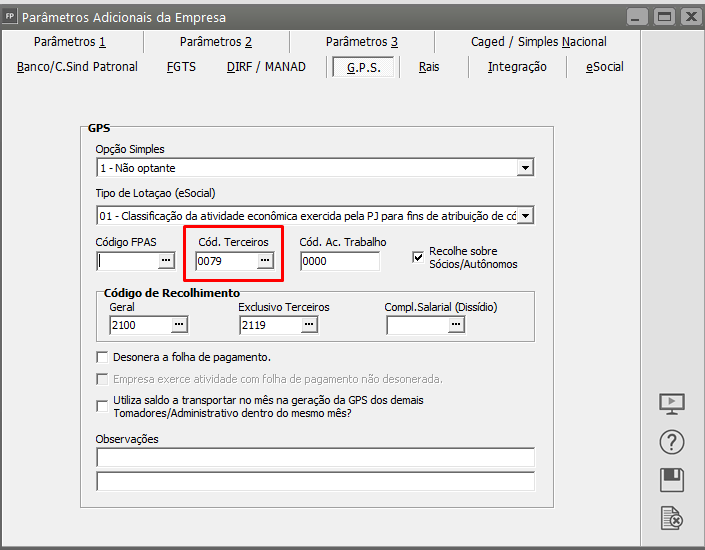 Correção: Acesse o menu Manutenção > Empresas > Parâmetros Adicionais da Empresa - aba G.P.S. e confira a informação cadastrada no campo Cod. Terceiros