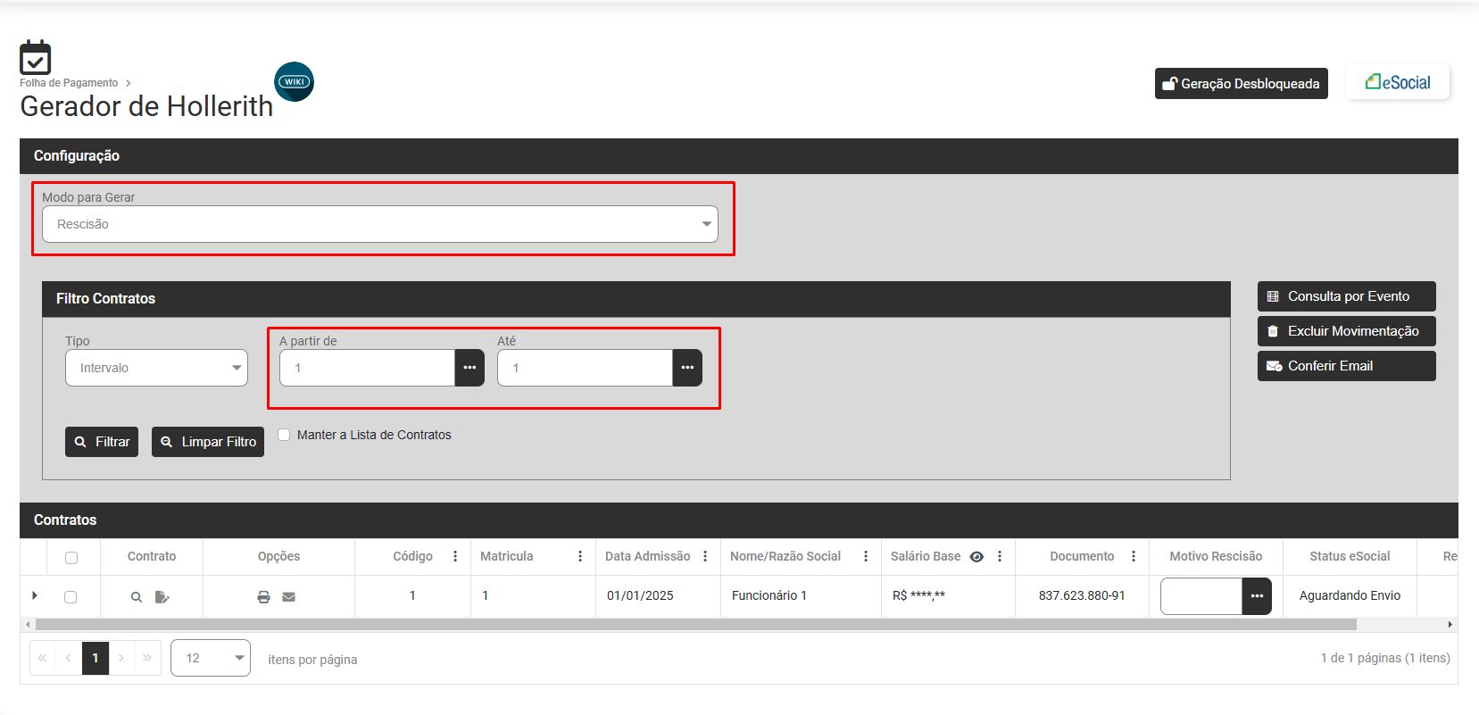 Defina Modo para Gerar Rescisão, Filtre pelo Contrato do Trabalhador