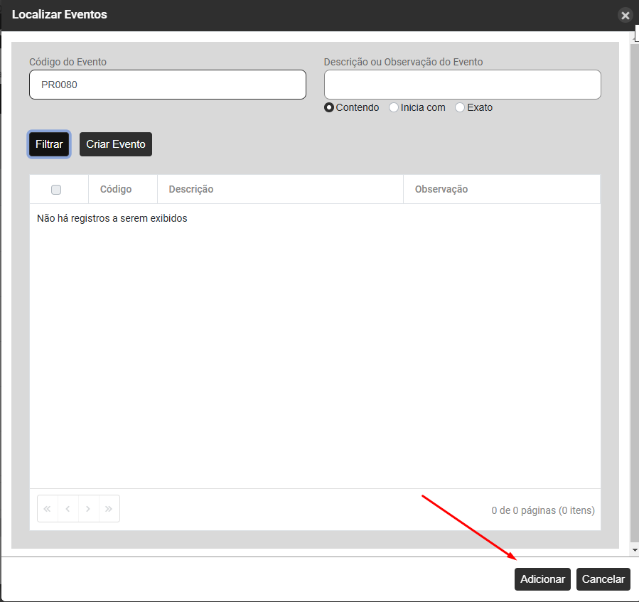 Caso não conste o evento, faça o cadastro do evento clicando no botão Adicionar