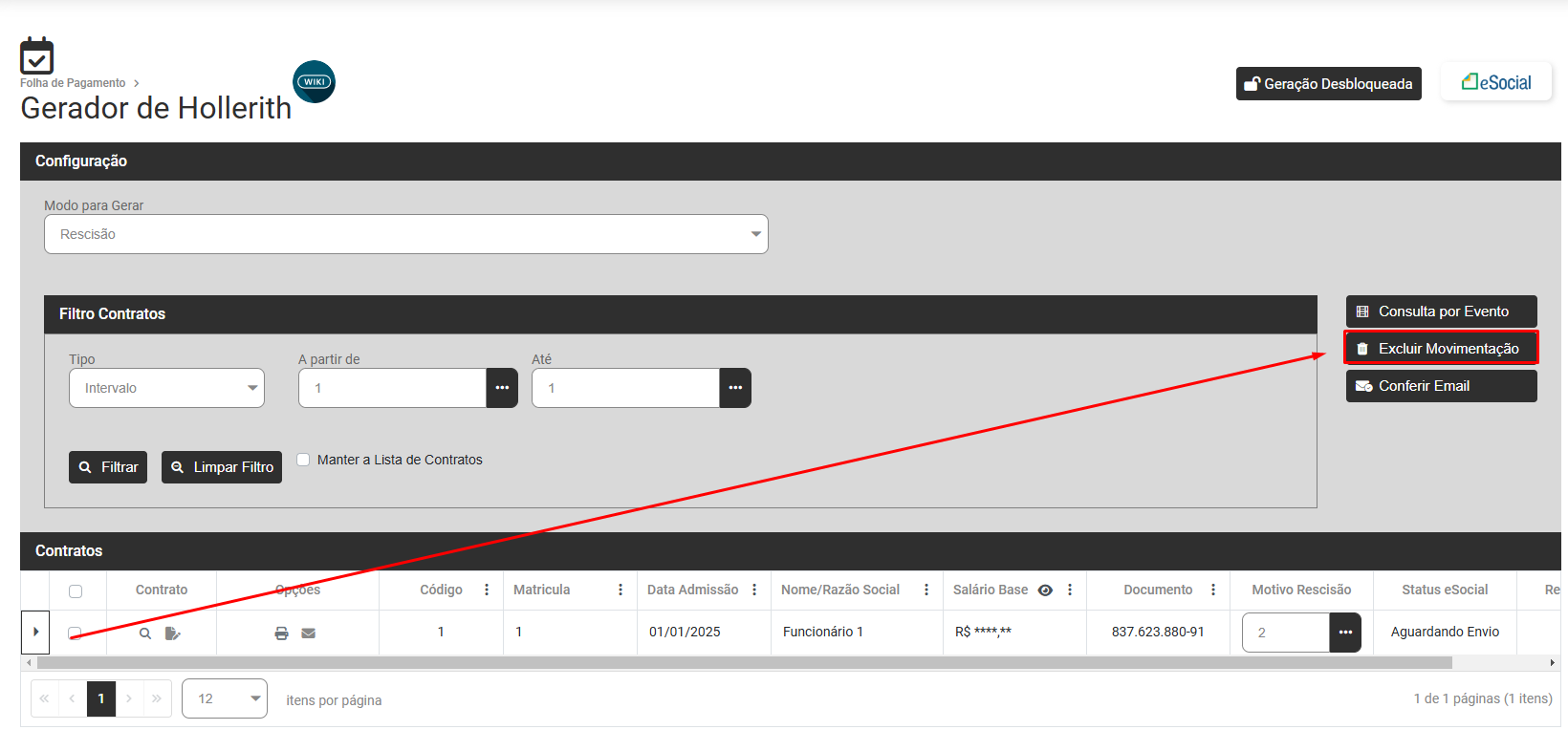 Em caso negativo, elimine a rescisão gerada, selecionando a rescisão e clicando no botão Excluir Movimentação