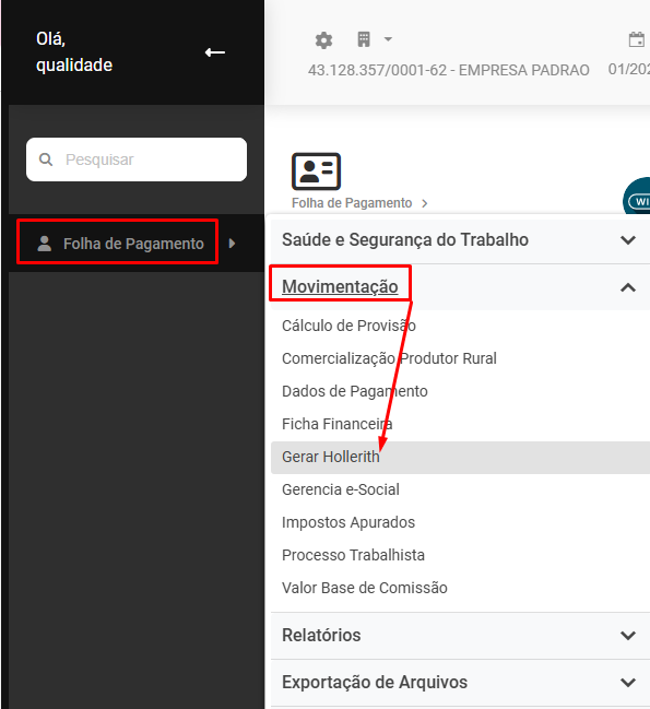 Correção: Acesse o menu Folha de Pagamento>Movimentação>Gerar Hollerith