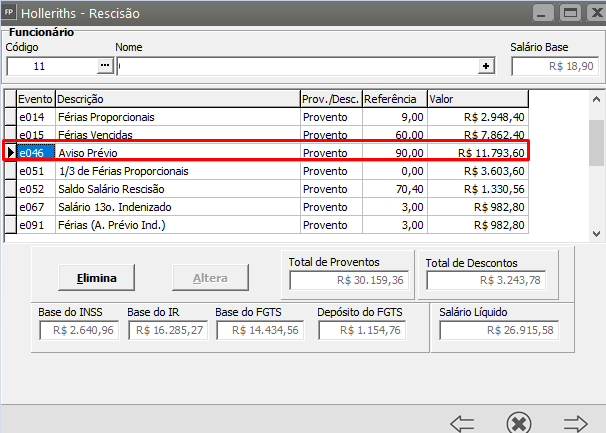 Verifique se o evento e046 (Aviso Prévio Indenizado) consta no cálculo da Rescisão