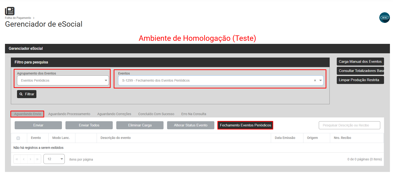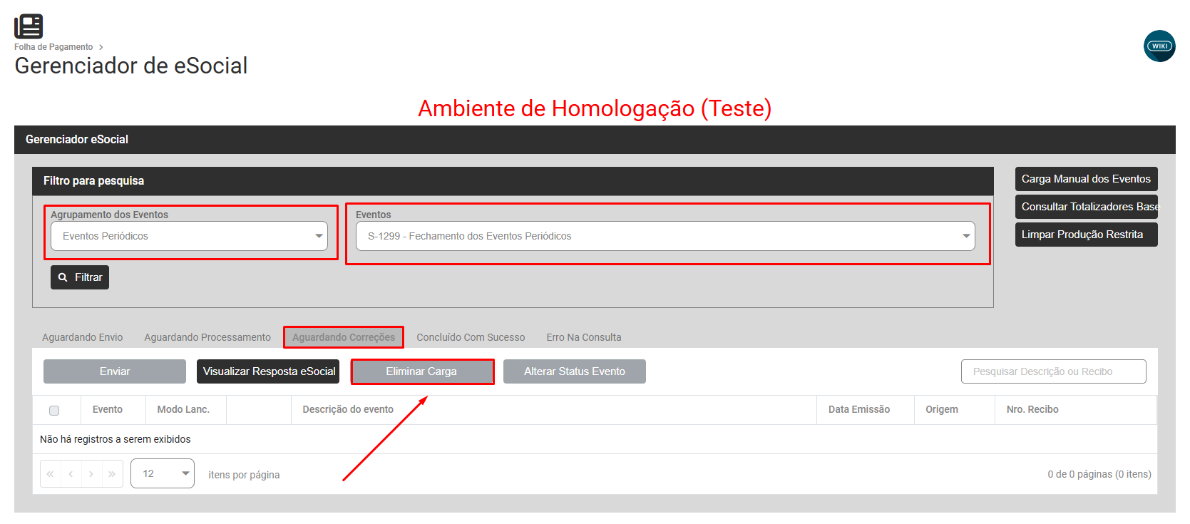 Filtre por Eventos Periódicos S1299 - Aguardando Correção selecione a carga e ELIMINE a carga que está na aba Aguardando Correção